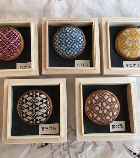 津軽地方の伝統的なこぎん刺しの図案「モドコ」柄のブローチ。