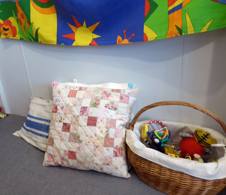 お店のキッズルームにも友達のお母さんが作ってくれたパッチワークのクッションを